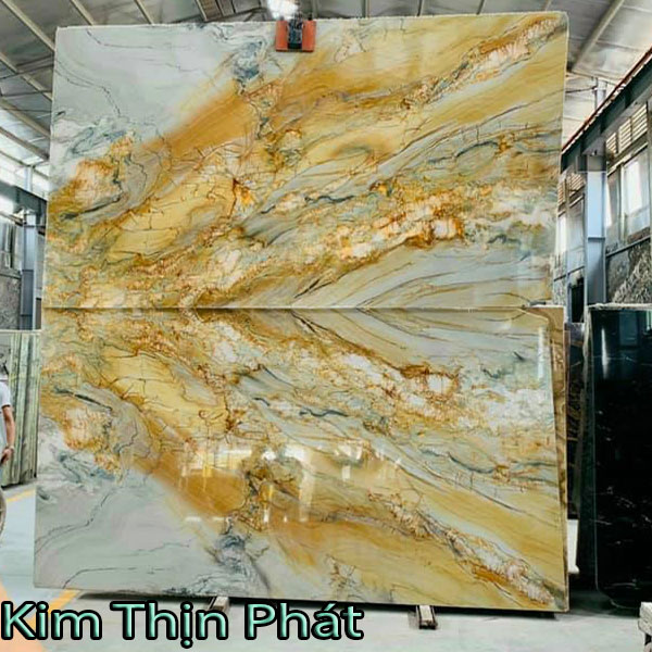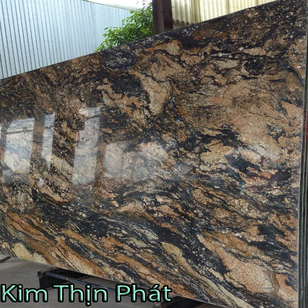 Đá hoa cương đẹp, nổi bật theo sắc vàng cùng họa tiết lượn sóng độc đáo tự nhiên theo từng điểm nhấn mày vàng, vàng, trắng đan xen với nhau hài hòa bông đá hoa cương. Màu vàng là màu tối, huyền bí cùng với điểm nhấn của những khoảng màu trắng, vàng, xám như hình ảnh ẩn dụ về những ngọn lửa ấm áp sưởi ấm không gian tối, thắp sáng hơn không gian đó bông đá hoa cương.